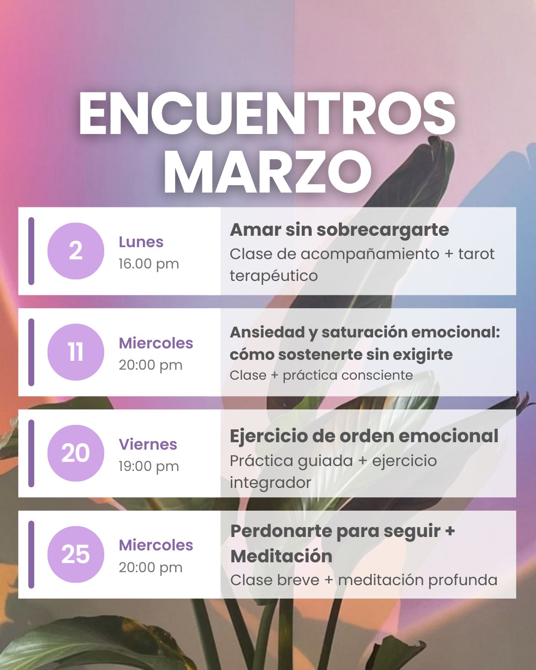Cada encuentro es una clase independiente, pensada para acompañarte desde el tarot terapéutico, la reflexión consciente,